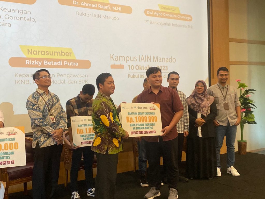 Akbar Rafsanjani Podomi, mahasiswa Prodi Ilmu Al-Qur’an dan Tafsir (IAT) Fakultas Ushuluddin Adab dan Dakwah (FUAD) IAIN Manado menjadi salah satu penerima beasiswa yang diberikan Bank Syariah Indonesia (BSI), pada hari Selasa (10/10) di Gedung Teater IAIN Manado.